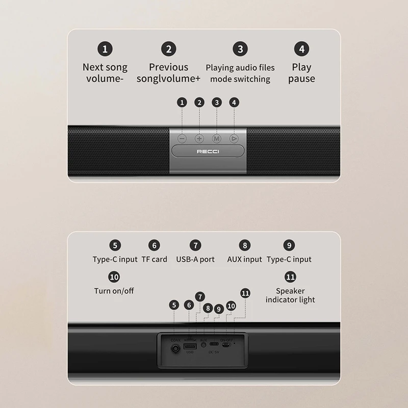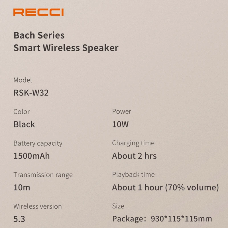 طراحی ظریفی دارد و کنار تلویزیون نمای زیبایی به منزل شما میدهد. دکمههای کنترل و پاور در پشت و جلو اسپیکر تعبیه شده تا بتوانید بهراحتی اسپیکر را کنترل کنید، دارای دکمههای متصل شدن بلوتوث، افزایش یا کاهش صدا، توقف آهنگ، تغییر حالت آهنگ در این صفحه تعبیه شده است. اسپیکر RECCI RSK-W32 با بلوتوث 5.3 سازگار است و اتصالی سریع و پایدار را رقم میزند؛ همچنین قابلیت اتصال چند دستگاه به طور همزمان هم برای شما مهیاست.